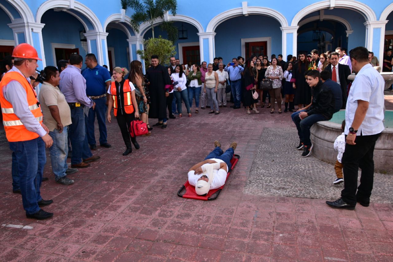 De igual manera, se realizó un simulacro de atención de primeros auxilios a un trabajador del ayuntamiento, implementándose tratamiento de heridas y traslado en camilla.