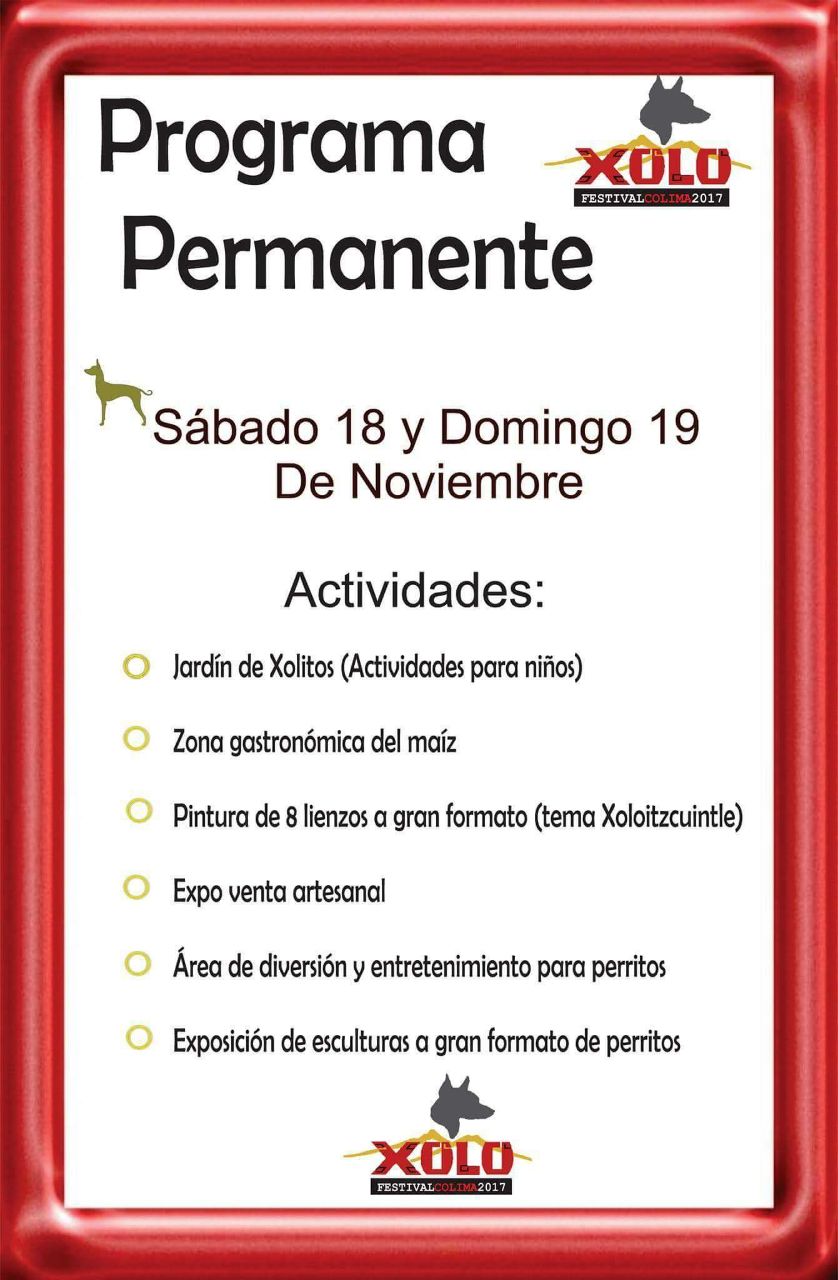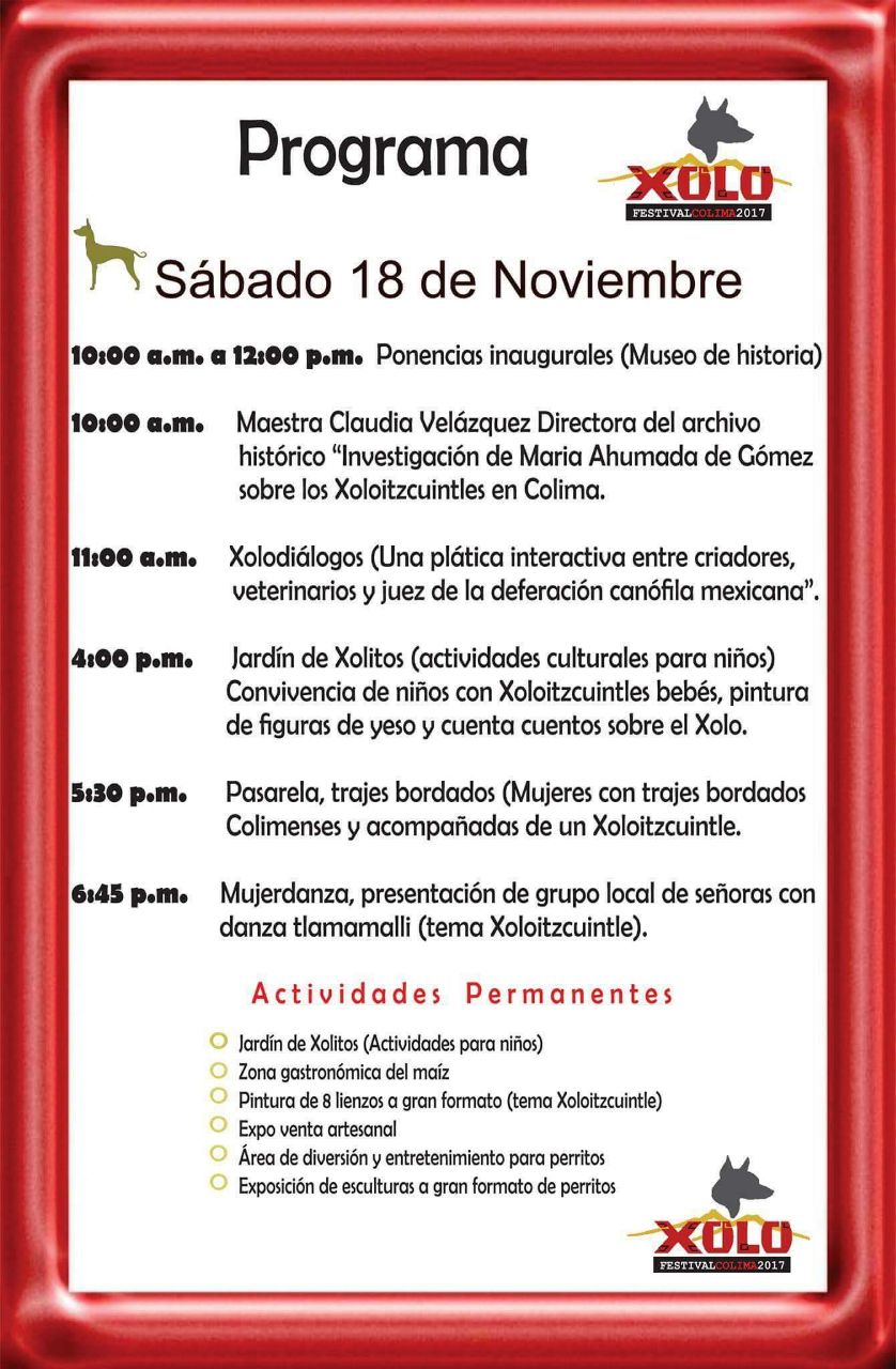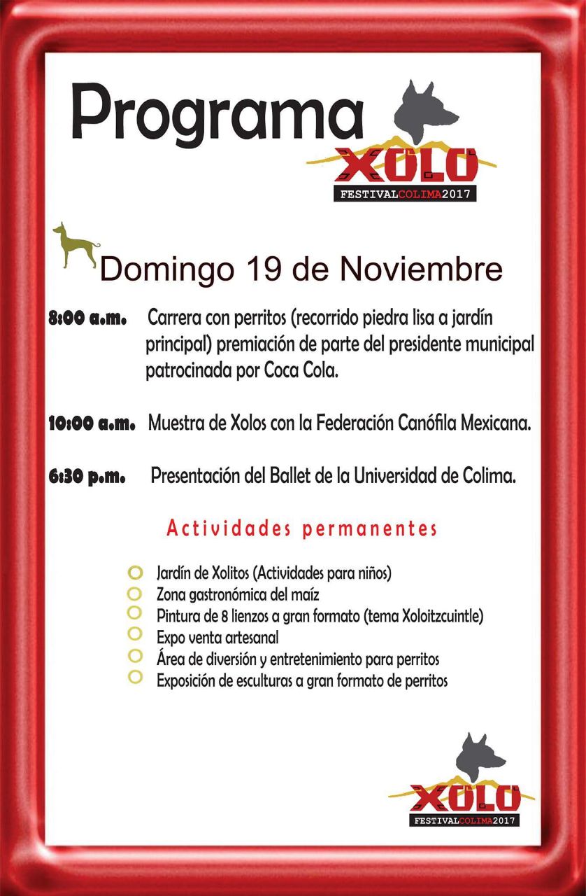 Para el domingo 19 de noviembre, a las 8 de la mañana, se llevará realizará la carrera de 3K con perritos; a las 10 de la mañana se realizará la Muestra de Xolos con la Federación Canófila Mexicana, y a las 6:30 de la tarde la presentación del Ballet Folklórico de la Universidad de Colima.