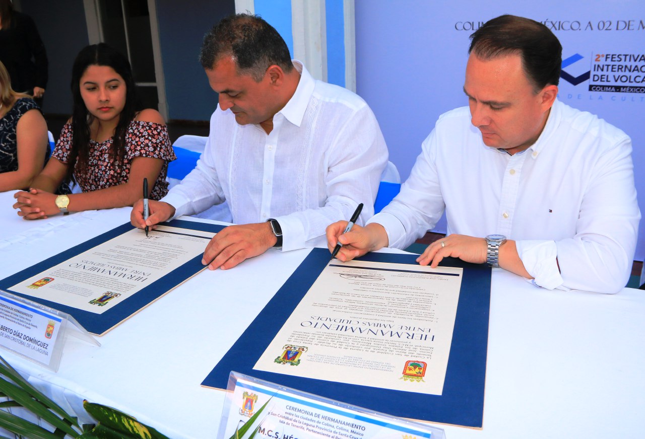 El presidente municipal de Colima Héctor Insúa García, y el alcalde de San Cristóbal de la Laguna Provincia de Santa Cruz de Tenerife, Reino de España José Alberto Díaz Domínguez, celebraron un hermanamiento con el fin de fundar buenas relaciones, promover la amistad y la buena voluntad entre ambas localidades.